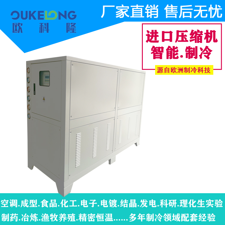 欧科隆牌冷水机全部工业冷水机组保护系统装置有:温度控制开关、防冻开关、可熔栓、高低压压力开关、过载保护器,压缩机过热保护器,压缩机频繁启动保护器及异常指示灯。