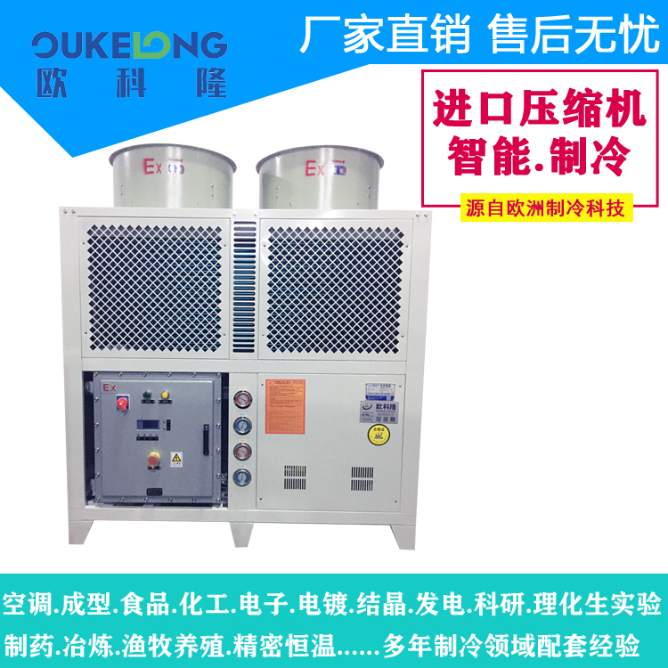 欧科隆15匹防爆冷水机专为化工、制药、锂电池等易燃易爆环境研发,通过国家Ex dⅡBT4防爆认证,整机采用防爆压缩机、防爆电控系统及无火花元件,确保危险场所安全运行,为关键生产流程提供可靠制冷保障。