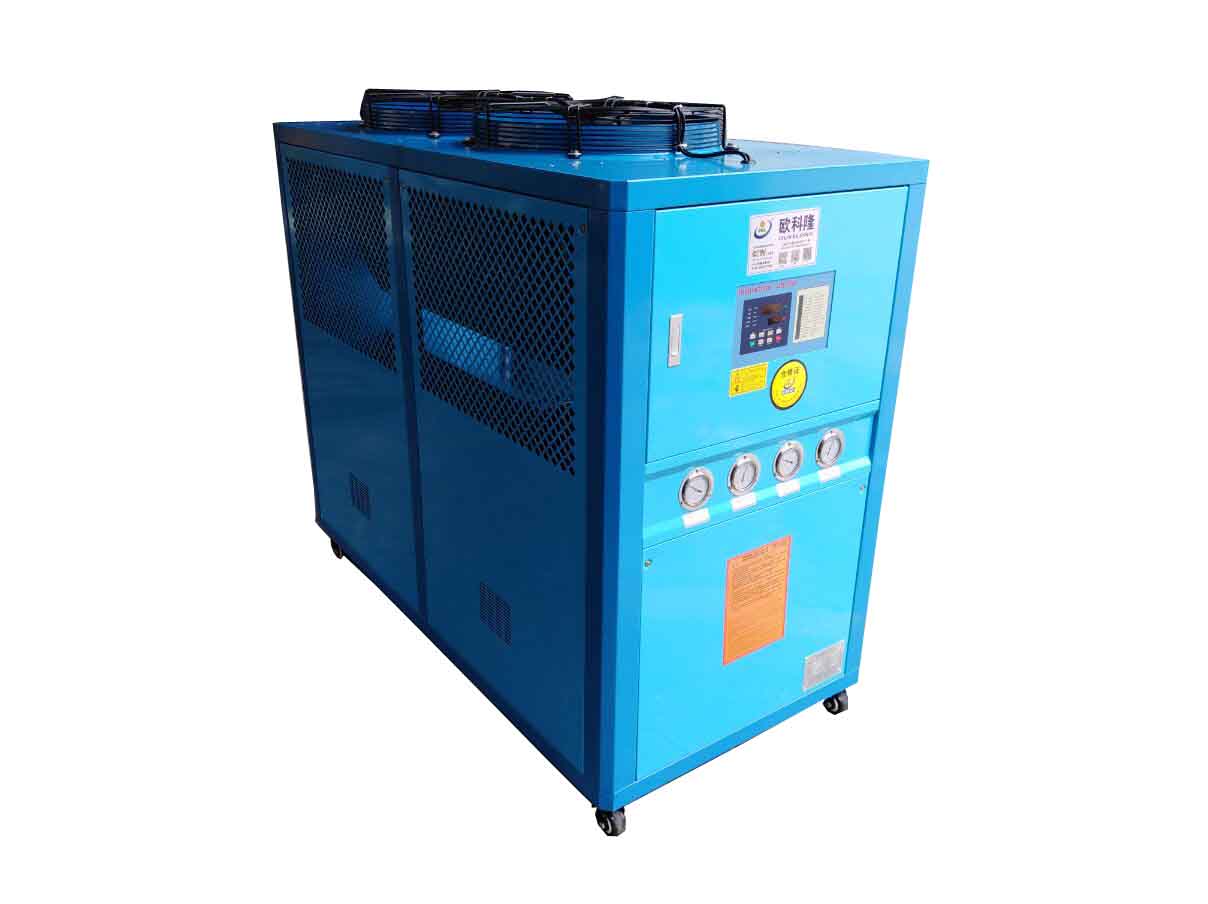 风冷式工业冷水机一般为整体机,及蒸发器、压缩机和冷凝器做在一起。对于稍大功率的风冷式工业冷水机,则需要考虑其工作时冷凝器散热风扇的散热问题。在空调厂房里应用,整体机需要设置排风道将散热风扇吹出的热量引到室外。