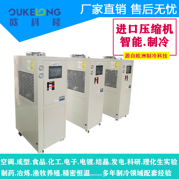 欧科隆芯片研发封装冷水机专为半导体制造、IC封装及高精度芯片测试设计,提供±0.1℃超精密温控,确保晶圆加工、光刻机冷却、封装测试等关键环节的稳定性,助力提升芯片良率与生产效率。
